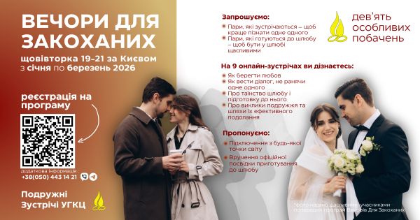 Вечори для закоханих онлайн 20.01.2026 – 17.03.2026. Після завершення програми Вечорів буде виданий сертифікат, який підтверджує проходження передшлюбних наук для наречених.