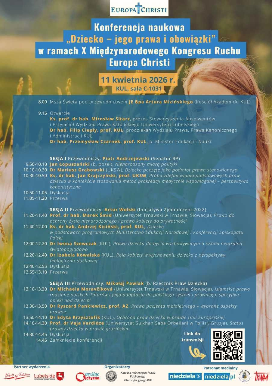 У суботу, 11 квітня, у Любліні відбудеться наукова конференція «Дитина – її права та обов’язки». Захід є частиною програми 10-го Міжнародного конгресу руху Europa Christi. Медіа-покровителями конференції є «Радіо Марія» та «Телебачення Trwam»..